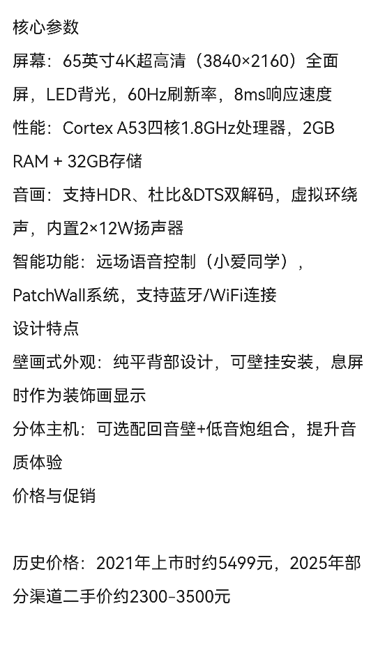 便宜出小米65寸高端壁画电视,小米高端分体4K液晶电视1500送货上门