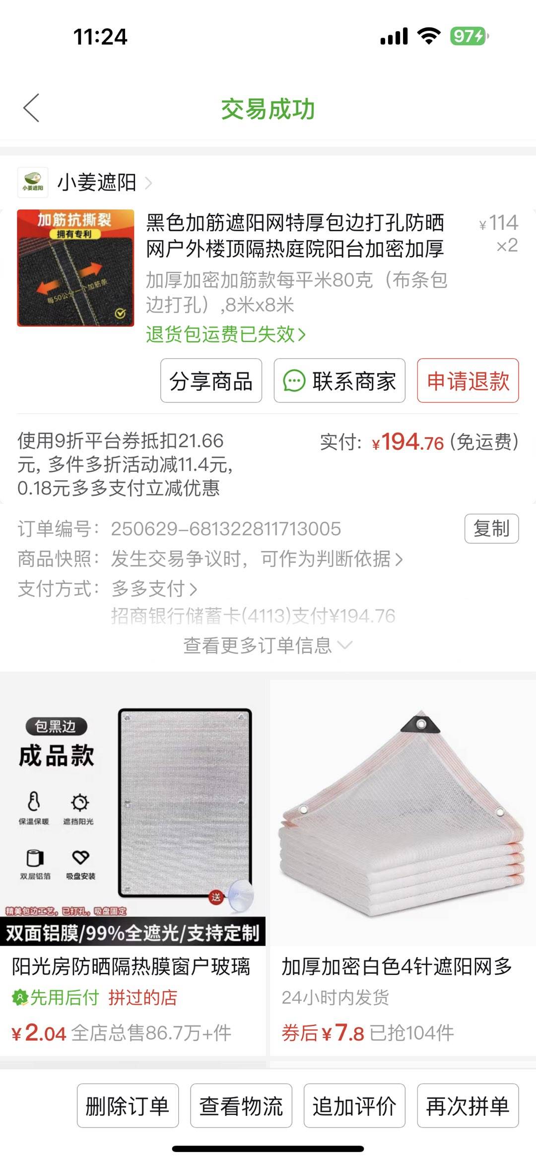 8×8全新加厚遮阳网2块,现在半价出售,100元,大麻自提