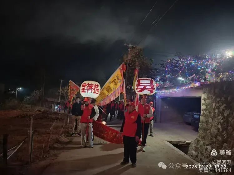 蛇年新春,暖日初升,2025年1月29日晚(年初一)【德著堂】宗祠前热闹非凡。吴氏宗亲从各地赶来,共赴这场迎春盛会,浓浓的亲情在欢声笑语中弥漫。 每年春节,年初一晚上【德著堂】吴氏宗亲进行巡游活动,打锣鼓、放烟花。这是南村吴氏一年一度的盛事。每逢此时,吴氏宗親汇集一起,一是联络宗族感情,二是和宗親们一同感受春节欢庆热闹的气氛。 此次巡游活动,宗亲们聚集南村【德著堂】宗祠,进行巡游活动,路线规划,由【德著堂】出发桐树窝(宣德堂)祠堂姜窝(承启居)祠堂最后到回【德著堂】放烟花,闹锣鼓;出行约100多人,每家每户不论男女老少齐参与,高举高灯、横彩、彩旗、灯笼……等。