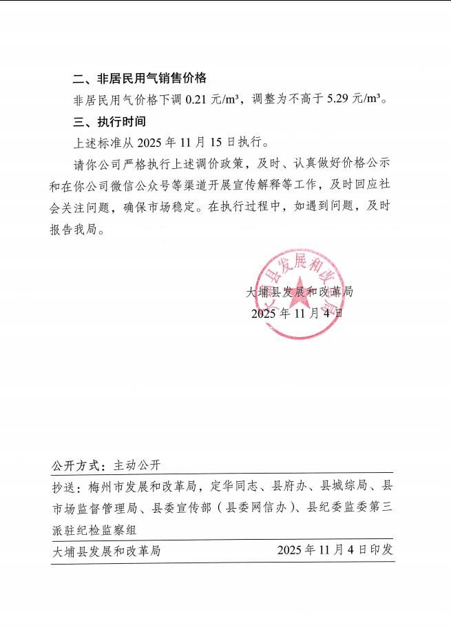 关于调整大埔县城区管道燃气销售价格的通知